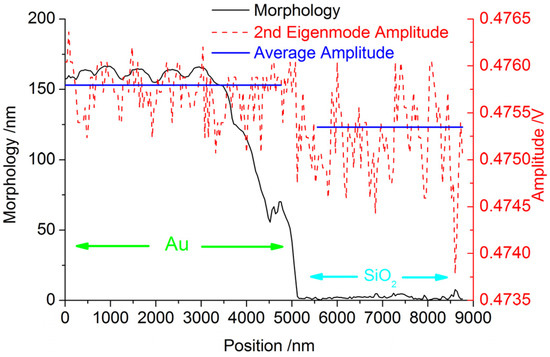 The sample consists of Au wire on a SiO2 substrate, the height of the Au wire is about 150 nm. The sample is coated with a 20 nm thick Cr layer as shown in Figure 14 to obtain the similar surface Young’s modulus (SiO2 substrate: 113.665 ± 4.031 Gpa, Au substrate: 119.382 ± 12.734 Gpa, measured by a nano indenter, Agilent Technologies Inc., Santa Clara, CA, USA). Figure 16 shows the results of a line on the sample and all the lines’ results are averaged and listed in Table 6.