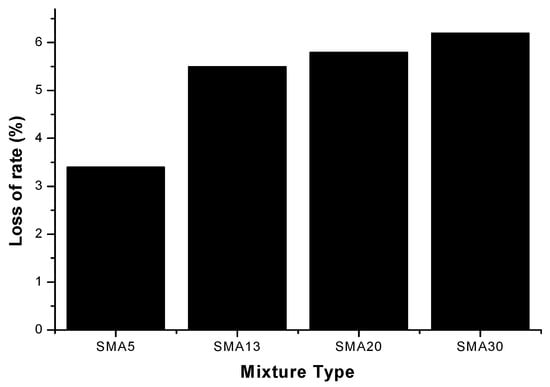 The Cantabro test results are presented in Figure 4, which illustrates a decrease of loss rate with the reduction of NMAS. Asphalt mixtures with smaller aggregate size displayed better raveling resistance than those with larger aggregate size. Therefore, SMA mixtures with smaller aggregate size can be designed to optimize the wear resistance of asphalt pavement.