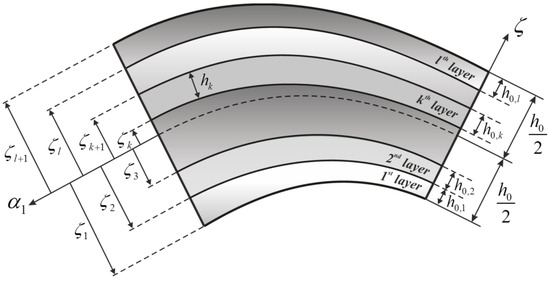 The excellent features of shells are enhanced by the introduction of innovative materials characterized by superior mechanical properties. For example, by using composite materials it is possible to manufacture light-weight structures with higher strength, reducing the amount of material needed to build them. Consequently, the main aim of many designers and engineers is to find the best mechanical configuration to solve particular structural problems, by combining in an optimal way several layers of composite materials. Thus, laminated structures became more popular due to this aspect, as it can be noted from the huge amount of related papers available in the literature [5,6,7,8,9,10,11,12,13,14,15,16,17,18,19,20,21,22,23,24,25,26,27,28,29,30,31,32,33,34,35,36,37,38,39,40,41,42,43,44]. It should be noted that laminates could be affected by some typical issues, such as delamination and stress concentrations at the interfaces, since various materials are used as constituents of the layers. In order to avoid problems associated with material mismatch at the layer interfaces, the class of Functionally Graded Materials (FGMs) was introduced. By assigning a continuous gradual variation of the mechanical properties along a specified direction, these composites do not show discontinuities in the material. As a consequence, the residual stresses and the stress concentrations that commonly affect a laminated structure can be reduced by mixing two or more constituents according to a specific graded distribution of the volume fraction. The wide use of FGMs is proven by the large number of papers published in the literature [45,46,47,48,49,50,51,52,53,54,55,56,57,58,59,60,61,62,63,64,65,66,67,68,69,70,71,72]. For the sake of completeness, it should be noted that the same idea of graded materials is currently employed to define also the volume fractions of nanoparticles such as Carbon Nanotubes (CNTs) in nanocomposites [73,74,75].