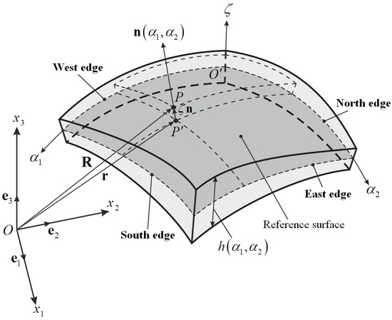 Let us consider a generic doubly-curved shell element with variable thickness as the one schematically depicted in Figure 2. It is completely identified by means of the position vector defined as follows