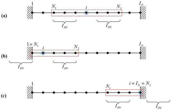 for . The symbol stands for the number of grid points that must be taken into account on the left and on the right of the point itself. It should be noted that the value of has to be set a priori. Due to the definitions shown in Equation (56), the values of is variable and assumes different meanings according to the position of the point within the domain. Figure 3 is introduced now to explain more clearly the significance of Equation (56). Let us assume that is placed in the center of the domain so that on both its left and its right the number of points is greater than . As it can be noted from Figure 3a, the derivative shown in Equation (55) is computed considering points, since and . Let us consider the circumstance in which is located next to the limits of the domain (or corresponds also to the boundary points). In these case, the value of can be greater than the number of points that actually appear on the left (Figure 3b) or on the right (Figure 3c) of . With reference to the case depicted in Figure 3b, one gets and , whereas and is set for the situation shown in Figure 3c. It should be clear that the variability of is given not to overcome the domain boundaries. Finally, the well-known GDQ method in its global form can be obtained by setting and for each value of .