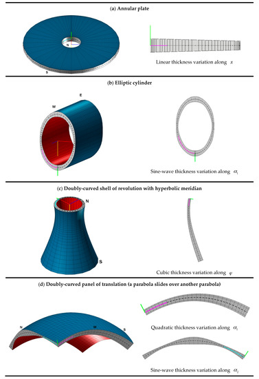- Bacciocchi, M.; Eisenberger, M.; Fantuzzi, N.; Tornabene, F.; Viola, E. Vibration Analysis of Variable Thickness Plates and Shells by the Generalized Differential Quadrature Method. Compos. Struct. 2016, 156, 218–237. [Google Scholar] [CrossRef]