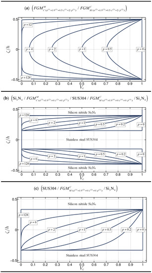 Thus, Equations (1)–(3) could be rewritten also as a function only of the volume fraction of one constituent. Several expressions are available in the literature to define the continuous and gradual variation of the mechanical properties along the thickness of the FGM layer [67]. In the current paper, a four-parameter power law is introduced for this purpose. Let us assume that the volume fraction is strictly related to the materials located to the external surfaces of the -th FGM layer. With reference to Figure 1, in which a generic stacking sequence made of FGM and isotropic layers is depicted, the -th ply is identified by the thickness coordinates and , which denote respectively the coordinates of its bottom and top surfaces in each point of the reference domain.