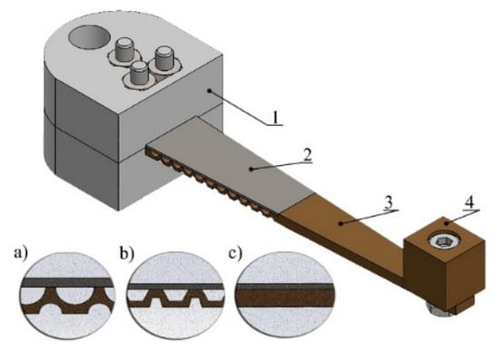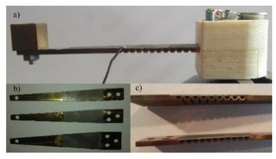 The experimental investigation was performed in order to validate the results of numerical investigation. Electrical and mechanical characteristics of the prototypes were measured and analyzed. Prototype cantilevers with the optimal dimensions were made (Figure 13). The material properties are given in Table 2. Moreover, plastic clamping structures were designed and manufactured for each cantilever.
