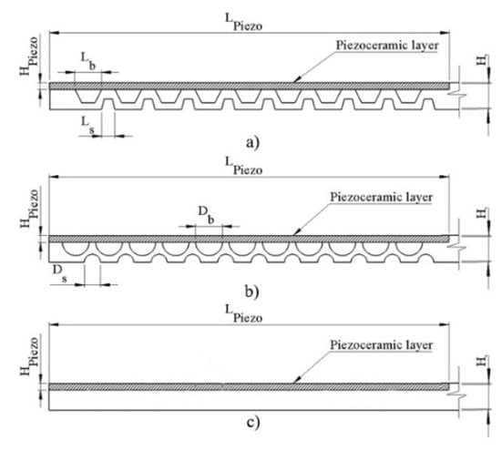 Numerical investigation of the cantilevers with conventional and two irregular cross-section designs was performed. A geometrical optimization problem for each cantilever was set as presented in Equation (6). The geometrical parameters and a side view of each investigated cross-section area design are presented in Figure 2 and Table 1, respectively. As shown in Figure 2, the cross-section modifications were made only under the piezo ceramic. The length of the modified cross-section area is equal to the length of the piezo ceramic LPiezo, i.e., 30 mm. This was made in order to obtain a constant strain and its distribution in this part of the cantilever.