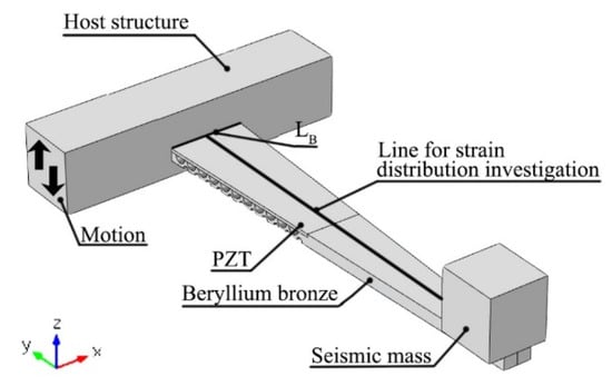 where ε(x) is strain; is a vertical force that is acting on the free end of the cantilever with a seismic mass; h is the distance between the centers of the cantilever and the piezo electric layer; YPiezo is the Young modulus of the piezoelectric material; lb is the length of the beam; le is the length of the piezoelectric material, which is covered by an electrode; I(x) is the second moment of inertia as a function of distance x from the fixed end of the cantilever.