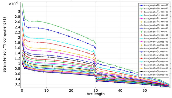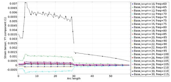 The third parametric sweep was conducted for the trapezoidal cantilever with trapezoidal gaps. The frequency range was set as in the previous two cases. The obtained strain characteristics are given in Figure 7. The analysis of the graph revealed that higher strain and its best distribution in the piezo ceramic were achieved when the width of the base was equal to 16 mm. Moreover, the strain increased significantly, and it is evenly distributed along LPiezo. The difference of the strain values at the fixed end and LPiezo is 14.16%, and it is 1.5-times lower in comparison with the conventional cantilever. The standard sample deviation of strain is 19.6 × 10−4. According to these results, it can be concluded that modifications of the cross-section area improved the strain and its distribution characteristics. Considering this, the electrical characteristics will be improved, as well.