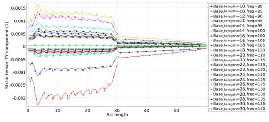 Next, the parametric sweep was conducted for the trapezoidal cantilever base LB2. The cantilever cross-section area was modified by cylindrical gaps. The frequency range was set according to the optimization problem in Equation 6. The strain characteristics are presented in Figure 6.