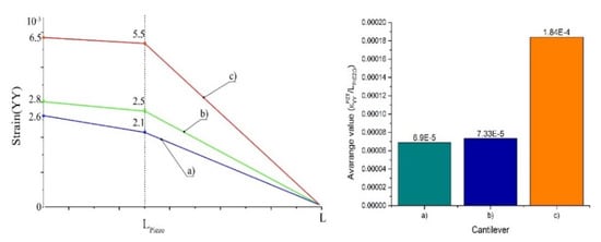 Strain functions and average values of strain: (a) conventional cantilever; (b) cantilever with cylindrical gaps; (c) cantilever with trapezoidal gaps.