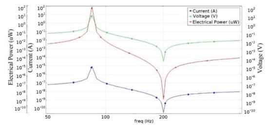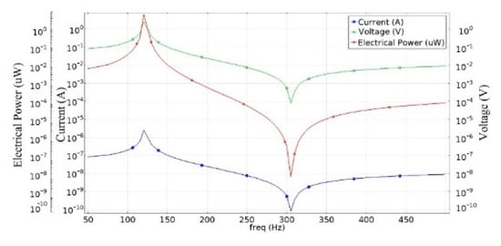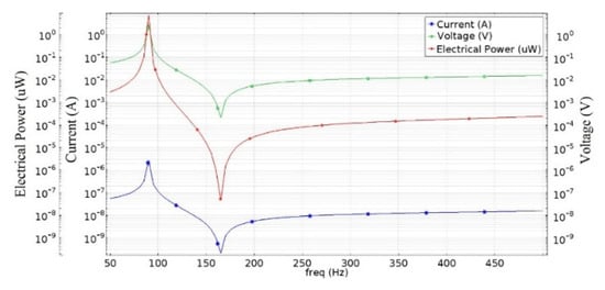 Firstly, the conventional trapezoidal cantilever was analyzed. A frequency response study was employed for this investigation. The frequency range from 50 Hz to 500 Hz was analyzed. The results of the electric outputs as a function of excitation frequency are presented in Figure 9. It can be noticed that the highest values of the electrical outputs were obtained at the resonant frequency of the trapezoidal cantilever. The output voltage on the electrical load is equal to 2.8 V. Moreover, the current is equal to 2.6 μA, and the average power of the system is 6.6 μW.