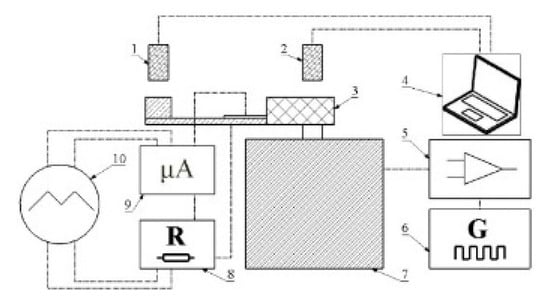 The next step of experimental study was to investigate the cantilever response to the different excitations of the base and measure electrical output densities versus resistance load. An experimental setup was built for this purpose. The principle scheme of the setup is given in Figure 15. It consists of two optical displacement sensors used for displacement control at the base and tip of the cantilever; a special plastic clamping frame was used to attach the cantilever to an electromagnetic shaker; a computer was used for displacement data recording and analysis; a function generator and a power amplifier were employed for driving the electromagnetic shaker; a variable resistive load was used as the electrical load of the cantilever; a micro current probe was used for low current measurements; an oscilloscope was used for control and recording of the current and voltage values.