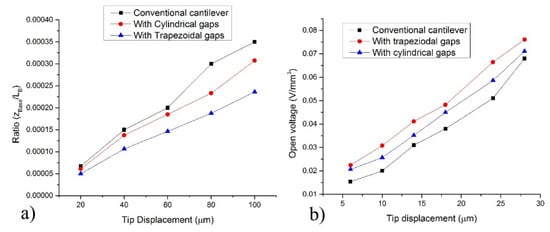 Output voltage density tip displacement characteristics: (a) conventional cantilever; (b) with cylindrical gaps; (c) with trapezoidal gaps.