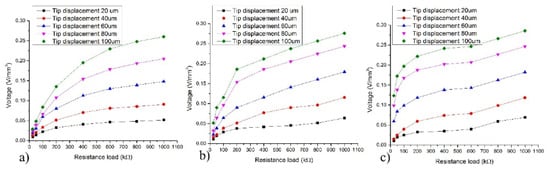 The output voltage density tip displacement characteristics for each cantilever were measured. The output voltage was measured by the oscilloscope Yokogawa DL2000 (Yokogawa, Tokyo, Japan). Variable resistance load was attached in parallel to the piezo ceramic. The tip displacement was controlled by optical sensors. The results of the investigation are given in Figure 17.