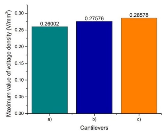 Graphs of Figure 17 show that modified cantilevers have higher values of output voltage density. Therefore, it can be concluded that modifications of the cross-section area have a positive influence on the electrical characteristics of the cantilevers. Comparing the maximum values of output voltage density, it can be seen that the output voltage density of modified cantilevers was increased up to 9.9% compared to the conventional cantilever (Figure 18). Considering this, it can be concluded that modification of the cross-section can ensure higher output voltage density. Moreover, such modifications ensure more effective piezo ceramic employment.