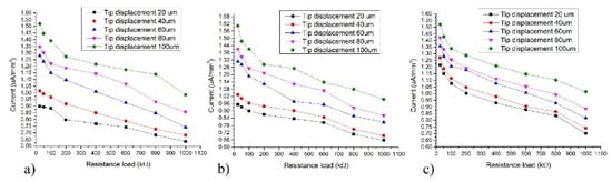 The output current density versus tip displacement were measured for each cantilever, as well. Current was measured by a micro current probe that employs the Burden voltage phenomenon. The probe was connected to the oscilloscope, and the values were recorded. The results of the investigation are given in Figure 19.
