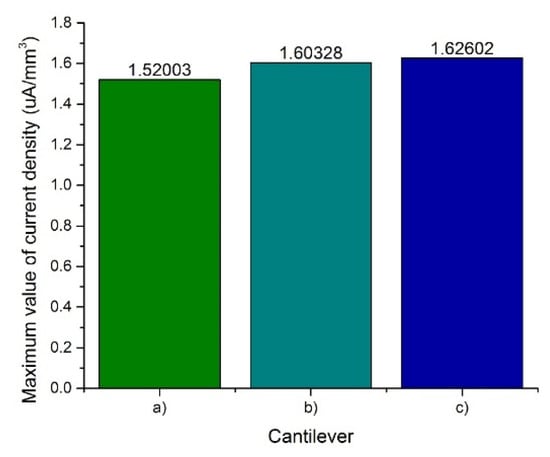 The results of the measurements showed that output current density was improved for cantilevers with a modified cross-section. Considering the results, it could be concluded that modifications of the cross-section area have a positive influence on the output current density. Comparing the maximum values for the output current density, it can be noticed that cross-section modifications increased output current density up to 6.9% in comparison with the conventional cantilever (Figure 20). According to the results of this investigation, it can be concluded that the energy conversion coefficient was improved by modifications of the cross-section area.
