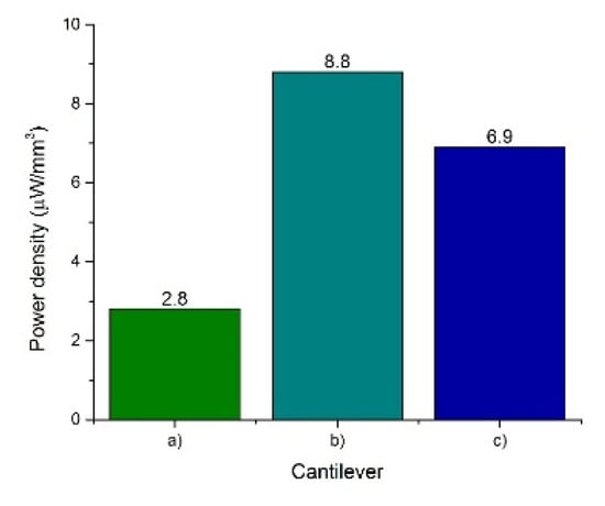 The comparison of the power density was made for each cantilever, as well. Such a comparison reveals the efficiency of each cantilever beam. Electrical power at 1 MΩ with the tip displacement of 100 μm was chosen as a critical parameter. The results are presented in Figure 21. A cantilever with cylindrical gaps has the best power density of 8.8 μW/mm3. This power density value is 3.14-times higher in comparison with the conventional cantilever.