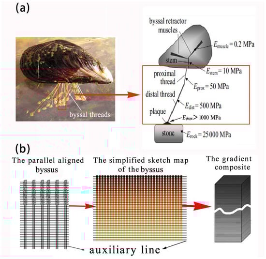 In nature, there are many gradient structures, e.g., bamboo, squid's beak and mussel byssus [31,32,33]. As shown in Figure 2, in order to resist the waves, mussel possess the natural strategy to minimize interfacial stresses via byssus anchor itself onto hard rocks, and 70% of the absorbed energy can be dissipated by the byssus [34,35,36,37].