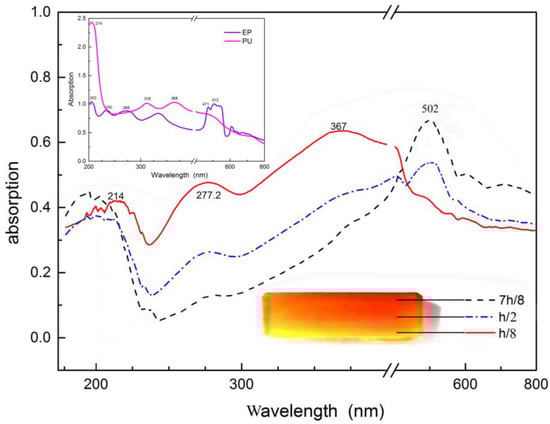 Ultraviolet absorption spectrum (UV-Vis) absorption spectra of the chosen regions in the gradientinterpenetrating polymer network (IPN). The top left insert is the absorption spectra of PU and EP. Here “h” represents the thickness.