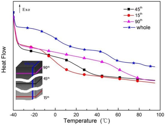 The baseline shift in DSC curve usually happens in the glass transition region of polymer due to the changes of heat capacity. As shown in the Figure 5, the Tg of the 15th, 45th and 90th layers are −16.3, 14.1 and 51.8 °C, respectively. The glass-transition temperature increases along with the gradient direction of IPN from bottom to top. That can be explained by the content decrease of the PU phase in the IPN sample. Because of the relative faster curing rate of the polyurethane, PU gels earlier, and it will result in the IPN structure with PU as its main body (fewer EP content) near the bottom side. In contrast, the top side is the IPN structure with EP as its main body. The DSC curve of the whole slice appears as a multi-sidestep shape; that can be explained by the gradient distribution of the PU phase along the thickness direction in the IPN sample.