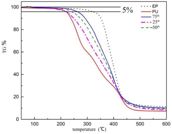 To investigate the thermo stability of sample slices in different regions of IPN sample, lmayers of the 75th, 50th, 25th, EP and PU were selected for TG analysis (Figure 6).