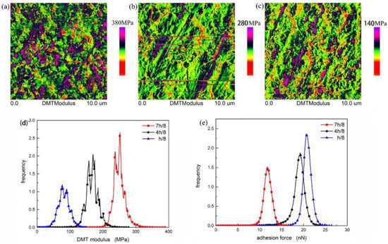 Quantitative nanomechanical property mapping images for 7/8 h (a), 4/8 h (b) and 1/8 h (c) of the continuous gradient IPN composite. The modulus images were taken after an absolute calibration process. Distribution histogram of the Derjaguin–Muller–Toporov (DMT) modulus (d) and adhesive force (e) at the corresponding selection regions.
