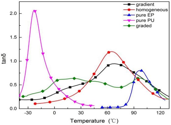 The best damping performance of EP and PU appears at −19.5 and 97.6 °C, respectively, thus they are not suitable for using alone. The IPN modification technology is one of the most widely used methods for polymer modification. As is shown in Figure 8, the damping temperature ΔT (in which loss factor value is larger than 0.3) of the homogeneous IPN locates in the range of 23.2–116.7 °C with a distinct peak (value: 1.21) at 65.8 °C, which can be used as traditional polymer damping material. However, though the damping temperature ΔT of this homogeneous IPN has been shifted into the general service temperature regions, their storage modules are not high enough to provide the self-supporting strength within the ΔT. The common improvement is pasting several IPN layers with different Tg together, which is named the graded IPN. DMA curves show that the damping temperature range of this graded IPN is from −25.8 to 120.7 °C, which is wider than the other IPNs. However, the tanδ of this graded IPN is less than 0.65, which is lower than others. What is more interesting, the gradient IPN has a good balance between the damping temperature range and the loss factor. It is suitable for using as a self-supporting damping structure which can provide self-supporting strength and keep its shape in working temperatures. When the soft side is pasted to substrates and the hard surface is exposed outside, this kind of structure can be used as a replacement of constrained damping structure, reducing stress concentration and risk of joint failure [48]. Besides, comparing to the graded IPN composite, the fabricating method of the gradient IPN is simplified.