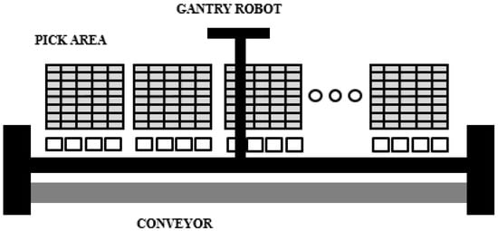A high-volume small parts spread buffer order-picking scheduling system is presented as a case study to illustrate the method. In this class of picker-to-goods order picking systems, item retrieval is decoupled from order assembly by a pick-to-buffer (P2B) technology [62]. In a P2B system items retrieved from pick locations are placed into a pick buffer. Items are deposited automatically into an order container placed on a conveyor when all items of an order have been picked. The physical layout of the order-picking system consists of four pick zones with a common conveyor. Robotic order-picking is considered. Each pick zone is assigned to a gantry robot. A pick zone consists of 30 product totes with each tote having 40 compartments. A compartment can accommodate 20 product units of one Stock Keeping Unit (SKU) type. The order-picking process is a sequential zone picking with batching. The order containers of each batch pass sequentially from one pick zone to the next one and all items to be picked in each zone are picked in one pass. Gantry robots can pick one product item at a time and deposit it in the nearest buffer. Customer orders are organized in five batches of 28 order containers each. Each order container contains a single customer’s order and can have multiple line items. One SKU type is collected in every order-picking process. A line item is a single unit of product. The conveyor speed is constant. Randomized storage is assumed. Figure 1 shows the layout of a pick zone (after [63]).