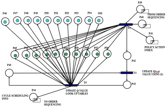 The Q-Learning substitution transition, shown in Figure 6, implements the Q-learning strategy. It contains the look-up tables of Q(s,a) values for states 1 to 10, as color tokens of color set QVAL, a list of REAL, stored in places P46 to P65, corresponding to the available policy state-action pairs (Table 1). The immediate reward and new state tokens are input tokens to the transition T3, stored in places P39 and P40 respectively. T3 fires to calculate the maximum Q-value for the new state, to be used in Equation (1) and the next policy action, held as color tokens in places P42 and P41 respectively. The next policy action token is used as input token to the Order Sequencing substitution transition (held in places P19, P20, and P25 of the Order Sequencing). Transition T4 updates the Q-value of the current state, using Equation (1). Transition T5 updates the tokens in the look-up table places of Q(s,a) values P46 to P65. T5 outputs to the Order Sequencing substitution transition a cycle scheduling information token, held in place P39, a list with the scheduling cycle index or indices corresponding to the terminal dummy environment state. At the end of the 1000 cycles, the Order Sequencing output tokens, held in place P13 and P14 in the Scheduling Agent subnet, are input tokens to the Final Order Sequencing Calculation substitution transition.
