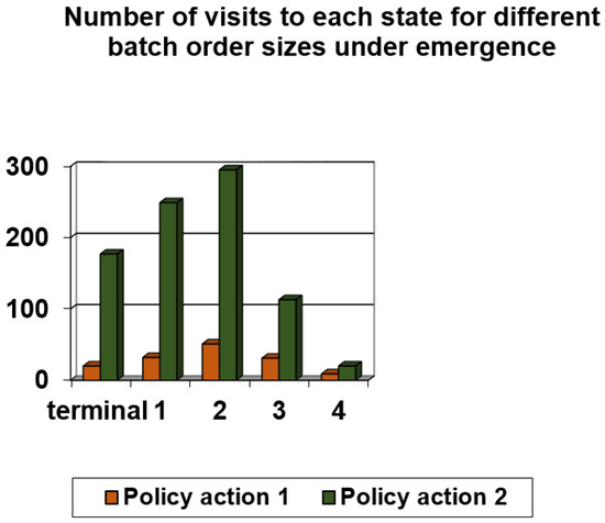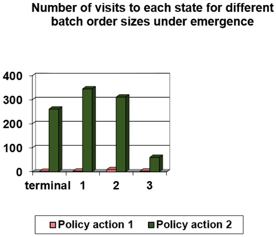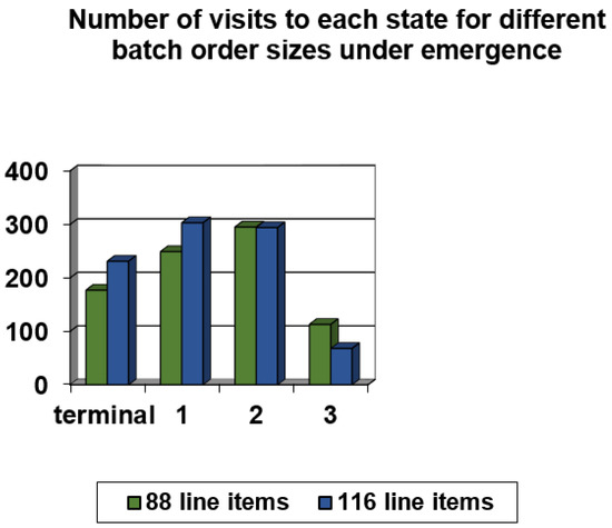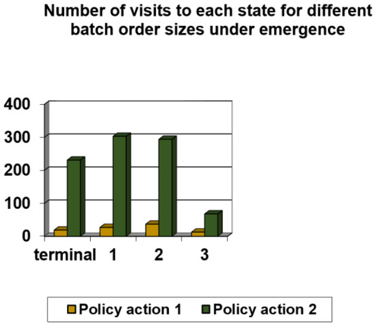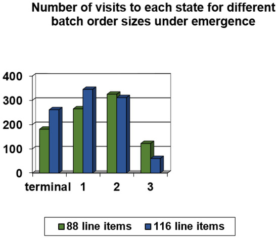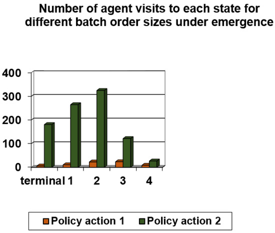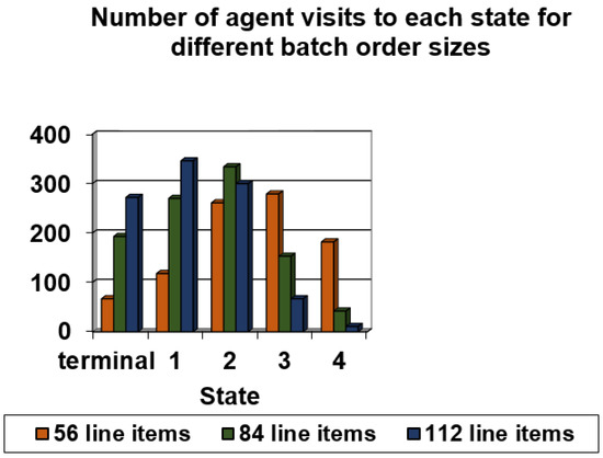 Simulation results for the scheduling of the first batch of orders for each considered case are shown in Table 9 and Figure 9, Figure 10, Figure 11, Figure 12, Figure 13 and Figure 14. Simulation results in Table 9 show the scheduling rule followed by the agent and the number of agent visits to each state for the scheduling of one batch of 28 orders with mean order size three line items per order and four emergency orders. The Q-learning was implemented with ε = 0. Figure 9 shows the number of agent visits to each state for the scheduling of one batch of 28 orders with mean order size (i) three line items per order; and (ii) four line items per order and four emergency orders, when the agent selected the second policy action. The Q-learning was implemented with ε = 0. The results in Table 9 and Figure 9 show that Q-learning converged to an optimal solution in all cases. The agent was trained by the Q-learning to achieve the scheduling goal, i.e., a minimal robot travel time as well as a balanced workload among robots. The balanced workload is better achieved when the agent follows the second policy action (Table 6 and Table 8), thus the agent was trained to achieve the optimal solution, since it favored the second policy action. Figure 10 and Figure 11 show the number of agent visits to each state for the scheduling of one batch of 28 orders with mean order size (i) three line items per order; and (ii) four line items per order and four emergency orders, respectively. Figure 10 shows the results of Table 9. Figure 12, Figure 13 and Figure 14 show similar results to the ones in Figure 9, Figure 10 and Figure 11, where the agent followed an ε-greedy Q-learning strategy with ε = 0.2. Results in Figure 9 and Figure 12 show that the differences in the number of agent visits to each state for different mean order sizes have decreased with the ε-greedy Q-learning strategy. Results from Figure 12, Figure 13 and Figure 14 also indicate that Q-learning converged to an optimal solution in all cases. The agent was trained to achieve the optimal solution, since it favored the second policy action when it followed the ε-greedy Q-learning strategy.
