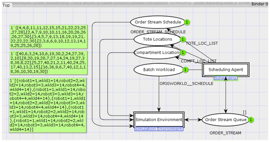 Figure 15 shows the top page of the implemented CTPN model for the scheduling of five batches of 28 orders each with order size of two line items per order. The color tokens show the order sequencing from top to bottom, with the list of tote pick locations and compartment pick locations, as well as the cumulative workload schedule.