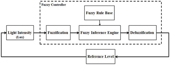 As shown in Figure 2, the fuzzy controller (surrounded by dash lines) is composed of four components: (1) Fuzzifier; (2) Fuzzy Rule Base; (3) Fuzzy Inference Engine; (4) Defuzzifier. The other two blocks, “Reference Level” and “Light Intensity (Lux)”, represent the reference voltage and the ambient light intensity, respectively.