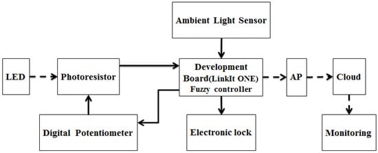 The complete hardware was shown in Figure 7. There were five main components in our work, including (A) system power supply circuit; (B) photosensitive resistor circuit; (C) development board (LinkIt ONE); (D) ambient light sensor circuit; (E) electronic lock.