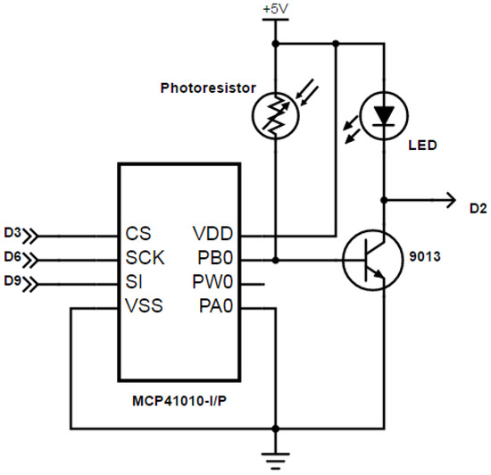 As illustrated in Figure 4, the photoresistor is connected to a 220 Ω limiting resistor in a serial circuit to protect the LED signaling light. The output of the photosensitive resistor divider containing a digital potentiometer MCP41010 and a photoresistor in parallel is connected to pin B of transistor 9031. Finally, Pin C of transistor 9031 is connected to pin D2 of LinkIt ONE, leading to signal magnification.