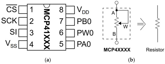 The MCP41010, shown in Figure 5a, is a digital potentiometer that is controlled using a serial peripheral interface (SPI). It is fully adjustable using 256 steps from approximately zero to 10 kΩ or about 39 Ω per step.