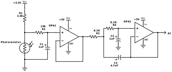 As shown in Figure 6 [22], the ambient light sensor circuit is a low-pass filter composed of two sets of operational amplifiers (IC TL072), a 1 μF capacitance, a 4.7 μF capacitance and an 8.2 kΩ resistor. This circuit only allowed signals with frequency less than 100 Hz to pass and its input is connected to the A1 analog pin of LinkIt ONE.