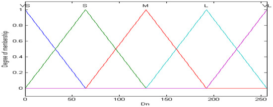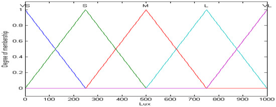 The original input value to the fuzzy controller was the explicit output from the ambient light sensor circuit. Therefore, we had to first fuzzicate this explicit value through a membership function in order to comply with the rules of fuzzy theory. In this work, the membership functions of the input of the fuzzy controller were categorized into five subsets (very small (VS), small (S), medium (M), large (L), very large (VL)) by the ambient light luminance ranging from 0 to 1000 Lux. On the other hand, the output from the fuzzy controller was set to be the MCP41010 variable resistance (Dn) of the photosensitive resistor divider. Its membership functions were also divided into five subsets by the same principle with a value ranging from 0 to 255. Figure 8 is the membership function for the ambient light luminance (Lux) and Figure 9 is for the MCP41010 variable resistance (Dn).