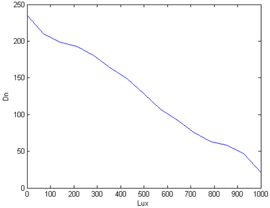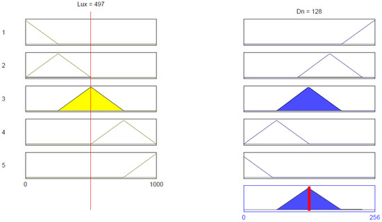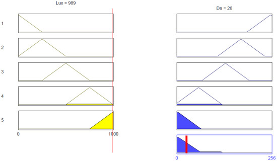 Depending on the variance in ambient light intensity (Lux) and adopting adequate digital variable resistance (Dn), we defined five general rules in the fuzzication database. The rules are as follows: