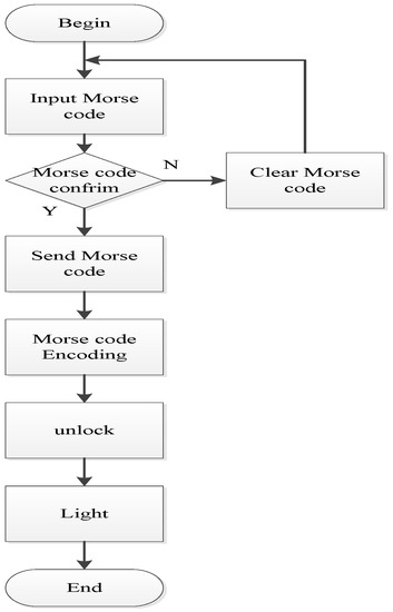The system flow chart for our novel electronic lock is shown in Figure 3. Firstly, the mobile phone coded the user’s numerical ciphers into a set of Morse code and sent out the according flashlight signals generated by its light-emitting components (LED). Secondly, the decoder’s photoresistor depicted the optical analog signals received on a voltage–time coordinate to translate it back to their original Morse code set through the built-in microcontroller. Thirdly, the system compared the result with the user’s command. If the codes match, the electronic lock would be opened and simultaneous reports on the user’s identity, system condition and time would be uploaded to the MCS cloud monitoring system by Wi-Fi so that distant users could keep control on their home security.