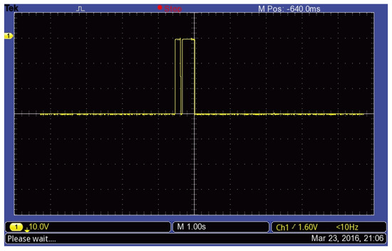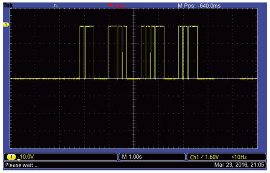 To prove whether the photosensitive resistor divider could faithfully translate flashlights into a corresponding Morse code, we measured the voltage difference (VCE) across the collector and emitter of 9013 using an oscilloscope. In Figure 17 and Figure 18, the voltage waveforms are magnified by ten-fold. We could see the obvious wide pulses and the other narrow pulses that represent “dashes” and “dots” respectively. Furthermore, both signals are correctly translated back to their original code, 1 and 1832, and then transmitted.