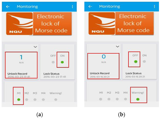 To evaluate the MCS cloud monitoring system, we tested it with correct and incorrect password inputs. In Figure 19a,b, it showed that the mobile app operated normally under either challenges. These experimental results match our expectations and prove the reliability and safety of our model. Apart from the “Lock Status” panel, the Arabic number indicates the identity of the transmitting end while the “Unlock Record” records the time point when an “open” instruction is made.