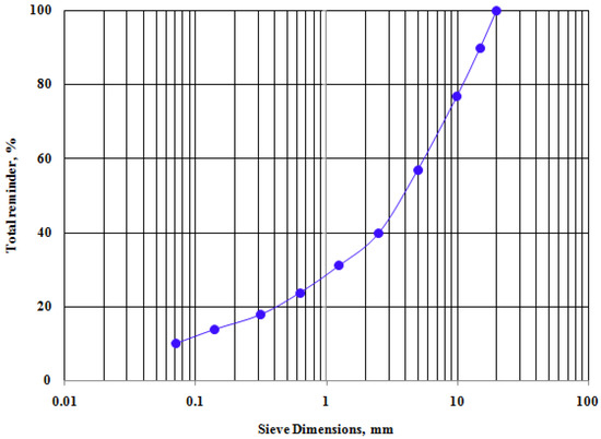 The bitumen content of grade 100–130 in the asphalt concrete was 4.8% by weight of dry mineral material. Basic standard indicators of the aggregate and the asphalt concrete are shown in Table 2 and Table 3, respectively. A granulometric composition curve for the mineral part of asphalt concrete is shown in Figure 1.