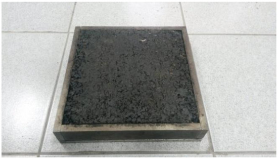 Samples of the hot asphalt concrete in the form of a rectangular prism with dimensions 15,050 × 50 mm (Figure 2) were manufactured as follows. First, the asphalt concrete samples were prepared in the form of a square slab (Figure 3) using a Cooper compactor (model CRT-RC2S, Cooper, Nottingham, UK) (Figure 4) according to the standard in [21]. The samples were then cut from the asphalt concrete slabs in the form of a prism. Deviations in sizes of the beams did not exceed two millimeters.