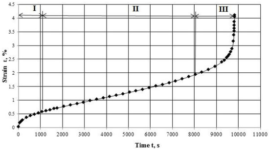 - The dependences were constructed for the start point, end point, and the duration of the stage of steady-state creep on the stress. The stress also impacts greatly on the specified time characteristics, where the increase of stress by one order increases these characteristics for 4.3–4.5 orders;