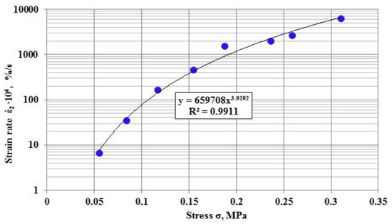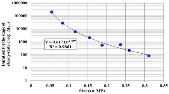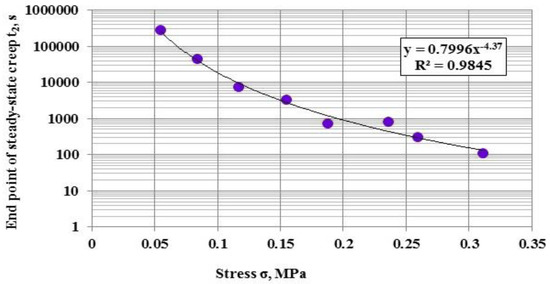 As mentioned above, the dependences of start point and end point of steady-state creep on stress are approximated by power functions, and in particular by the following ones (Figure 9 and Figure 10):