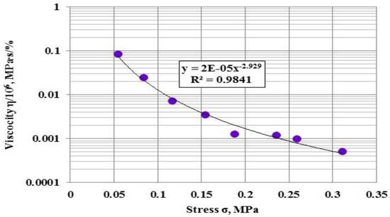 The dependence of viscosity of asphalt concrete on stress, constructed under the Equation (8) with the use of experimental results, is shown in Figure 12, which is satisfactorily approximated by a power function. The stress impacts greatly on the viscosity of asphalt concrete, the increase of stress by one order reduces the viscosity by three orders.