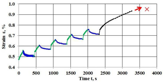 Curve of asphalt concrete strain during cyclic loading, green line: creep under load; blue line: recovery of strain after unloading; red cross: failure.