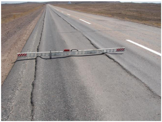Plastic strains (the depth of the rut is more than 60 mm) in asphalt concrete layers of the highway “Ekaterinburg-Almaty” (km 1903.1—Karaganda Region, Kazakhstan).