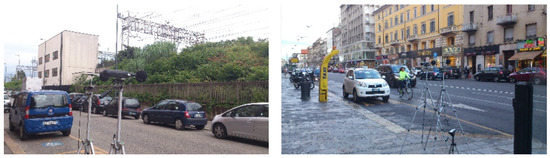 The main goal of the recording campaign was to collect widely diverse samples of road traffic noise and anomalous noise events in order to provide a general picture of the real-life scenarios the dynamic noise mapping system will be working on. To that effect, several recordings were conducted between the 18 and 21 May 2015 in specific locations of the two pilot areas of the DYNAMAP project, covering both urban (Milan) and suburban (Rome) scenarios. These locations were selected according to representative traffic conditions and acoustic characteristics of the pilot areas (see [36,37] for further details).