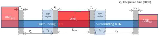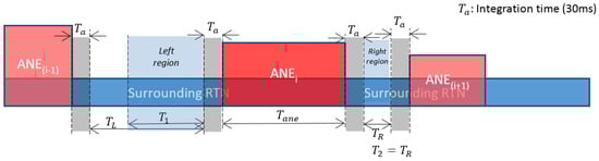 The automatic process searches for the closest time regions to the current anomalous noise event (ANE) trying to obtain as many samples of background or road traffic noise as the number of samples contained in the anomalous noise event (). Moreover, a time margin equal to the integration time used for the computation is excluded from the ANE surrounding regions to avoid including transients caused by the start and end of the ANE, obtaining more accurate estimations (see in Figure 4, Figure 5 and Figure 6). In Figure 4, a theoretical example of a balanced set of regions is shown.